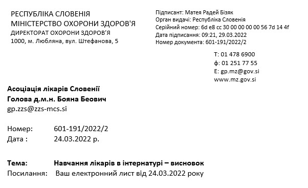 Якщо Міністерство охорони здоров’я вимагає від вас пройти стажування та/або скласти професійний іспит, зверніться з цього приводу до Медичної асоціації Словенії.