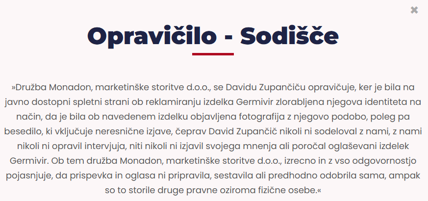 Zdravnik David Zupančič je po vložitvi pravnih sredstev dosegel javno opravičilo podjetja, ki je neupravičeno uporabilo njegovo ime in podobo za oglaševanje izdelkov. Podjetje je po pravni poti priznalo odgovornost, se opravičilo in poravnalo odškodnino, kar predstavlja redko, a pomembno zmago v boju proti kraji identitete zdravnikov.