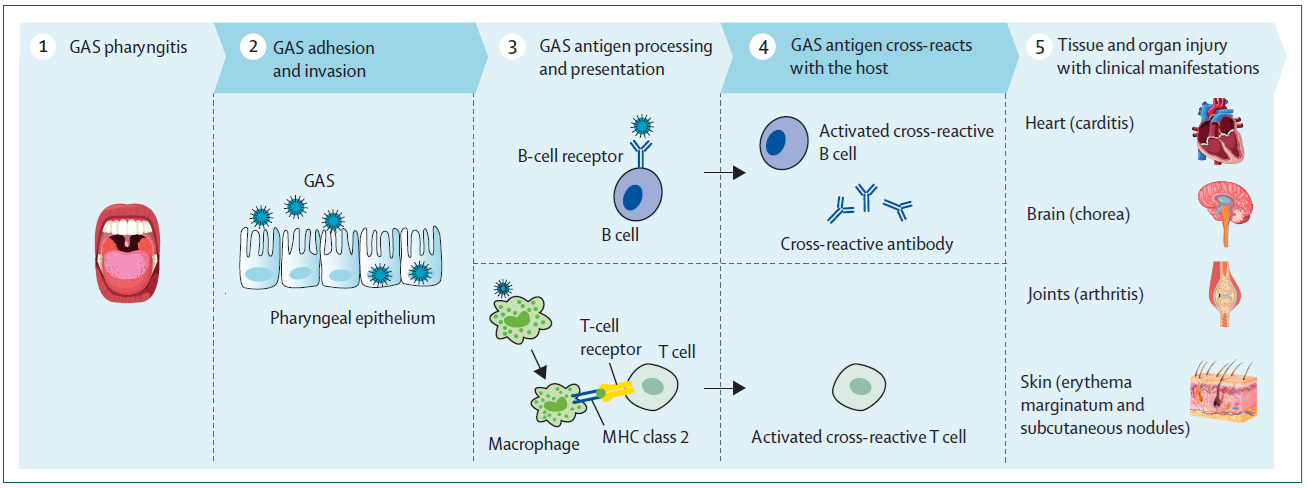 Podnapis k zgornji sliki: Proces molekularne mimikrije v patofiziologiji akutne revmatične vročice (ARV): po okužbi žrela z β-hemolitičnim streptokokom skupine A (SSA) (1) pride do adhezije in invazije epitelija žrela (2). Predstavitev antigenov SSA vodi do aktivacije B- in T-limfocitov (3). Aktivirani T-limfociti ter protitelesa, ki jih tvorijo aktivirani B-limfociti, križno reagirajo z antigenimi epitopi (4) v srcu, možganih, sklepih, koži in podkožnem tkivu, kar povzroči klinične manifestacije ARV (5). Križno reaktivna protitelesa se vežejo na ogljikove hidrate skupine A, kar sproži povečano izražanje adhezijskega molekularnega proteina 1 endotelija srčnih zaklopk (VCAM-1), posledično pa pride do infiltracije T-celic in citokinsko posredovane imunske poškodbe. Križno reaktivna protitelesa, ki se vežejo na dopaminske receptorje in lizogangliozide, povzročijo Sydenhamovo horeo. Zakasnela preobčutljivostna reakcija (tip IV) povzroča kožne in podkožne spremembe, medtem ko odlaganje imunskih kompleksov v sklepih vodi v artritis.