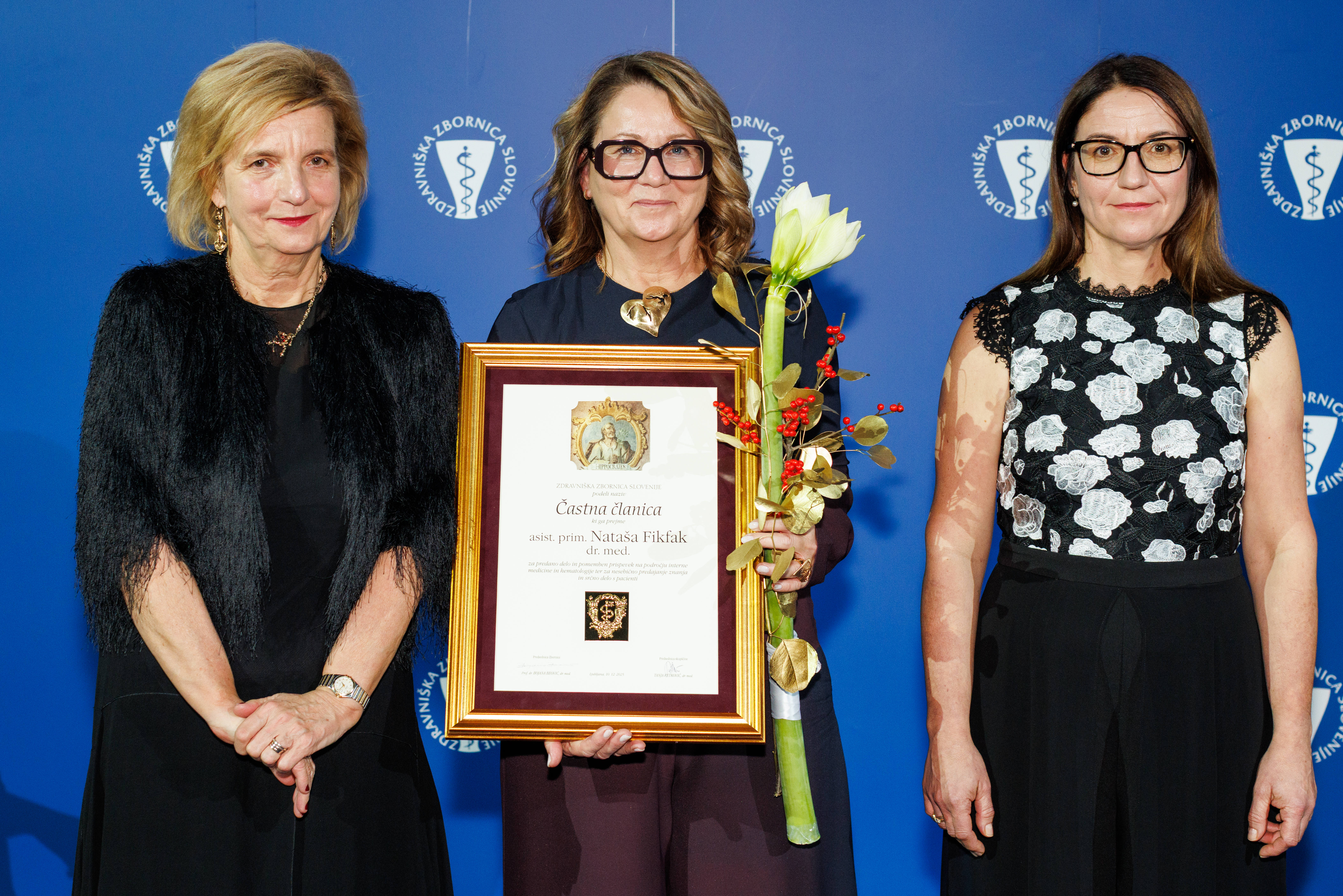 Naziv častna članica je prejela prim. Nataša Fikfak, dr. med., za predano delo in pomemben prispevek na področju interne medicine in hematologije ter za nesebično predajanje znanja in srčno delo s pacienti.