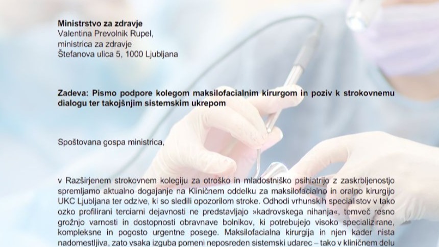 Objavljamo pismo Razširjenega strokovnega kolegija za otroško in mladostniško psihiatrijo, naslovljeno na Ministrstvo za zdravje. Pismo je izraz strokovne solidarnosti s kolegi maksilofacialnimi kirurgi UKC Ljubljana ter hkrati jasno opozorilo na širše, sistemske težave slovenskega javnega zdravstva.